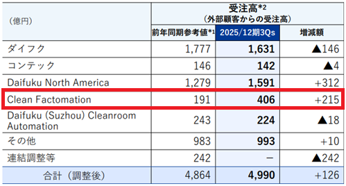 以下がセグメントごとの受注高だが、半導体工場向けが主である「Clean Factomation」では、前年同期比で受注が2倍に伸びた。