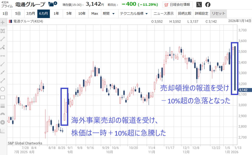 2026年1月14日は日経平均が史上最高値を更新する中、電通は数少ない急落銘柄となった。