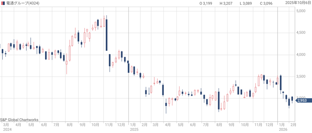 電通グループの株価は、わずか1年弱で4,800円から2,900円台へと大きく下落した。