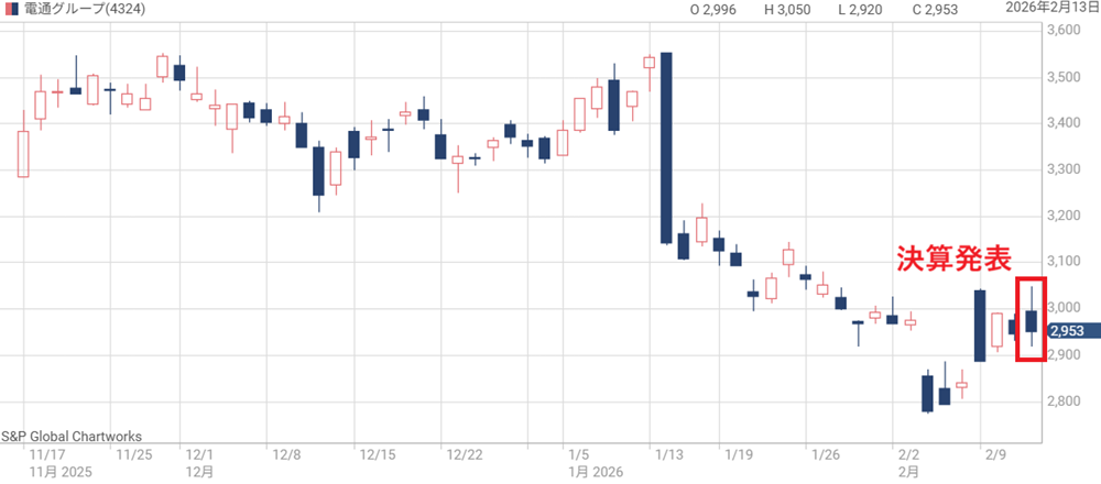 しかし、その後は下落基調が続き、2026年2月時点で2,900円前後で推移している。