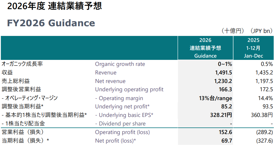海外では3,400人規模の人員削減や拠点整理といった構造改革を進めており、2026年以降は収益改善効果が期待できる。