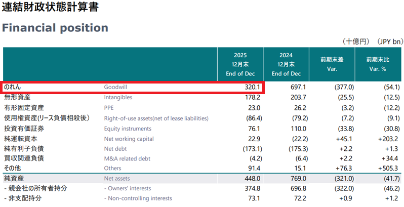 2025年度に約4,000億円の減損損失を計上したため、のれん額は以前から半減し、減損リスクは大きく減りました。