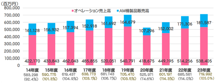 アミューズメント業界は2020年にコロナ禍で大きく縮小したものの、その後は回復が続き、2023年度には過去最高の売上高を更新した。