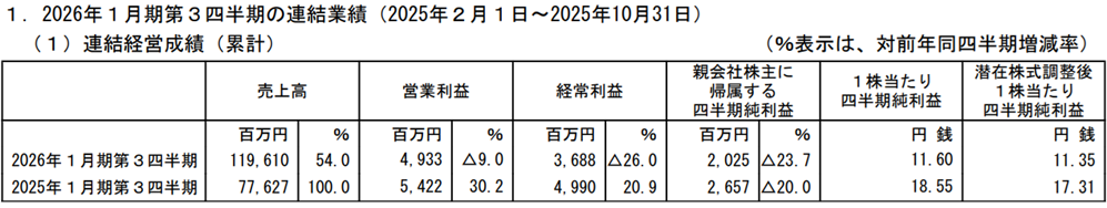 2025年12月12日に発表された3Q決算(2026年1月期)は、営業利益が-9%の減益、純利益は-23.7%の減益だった。