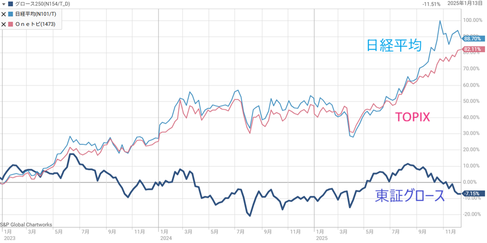 過去3年間を振り返ると、日経平均やTOPIX関連銘柄は+80%と大きく上げた一方、東証グロースは-7%に沈む。