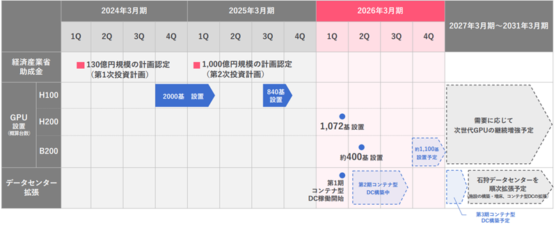 2026年3月期にはH200を1,072基、B200を約400基設置しており、購入費用は1,000億円規模だ。