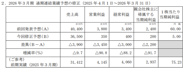 その結果、純利益予想が24億円から2億円へと引き下げられた。