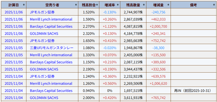 決算直前は空売り残高が0.5%未満となり報告義務が消失していたが、決算の翌営業日(11月4日)から再INし、11月6日までに400万株以上の空売り残高に達した。