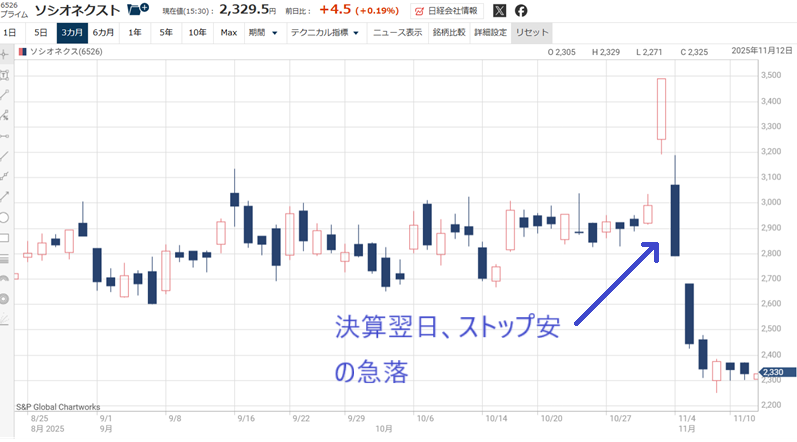 今回のソシオネクストの株価急落は、業績予想の下方修正と、決算前日のストップ高による反動が重なった結果だ。