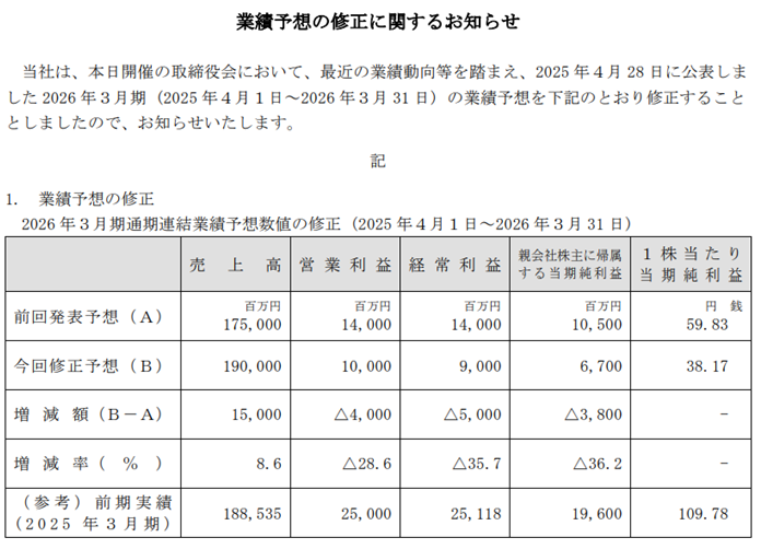 業績下方修正の主な数値。営業利益・経常利益・純利益が35%前後の引き下げとなった。出典:業績予想の修正に関するお知らせ