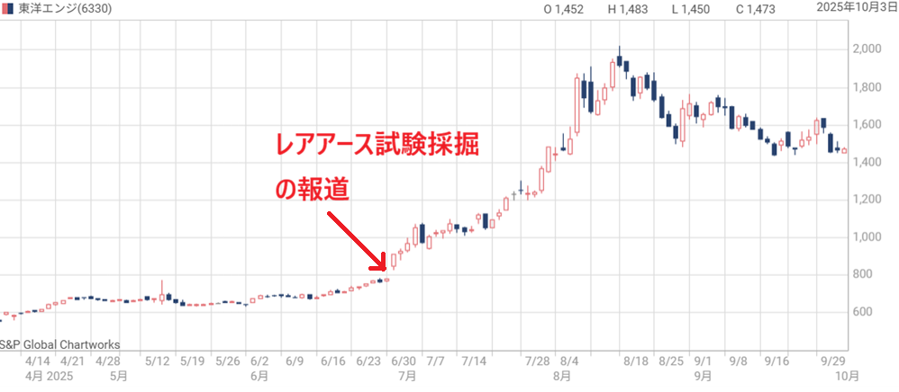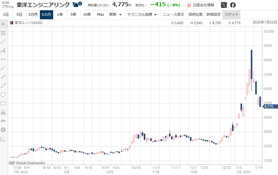 東洋エンジニアリングの株価は、南鳥島沖のレアアース開発という国策期待、そして地政学リスクを背景とした思惑買いによって急騰した。