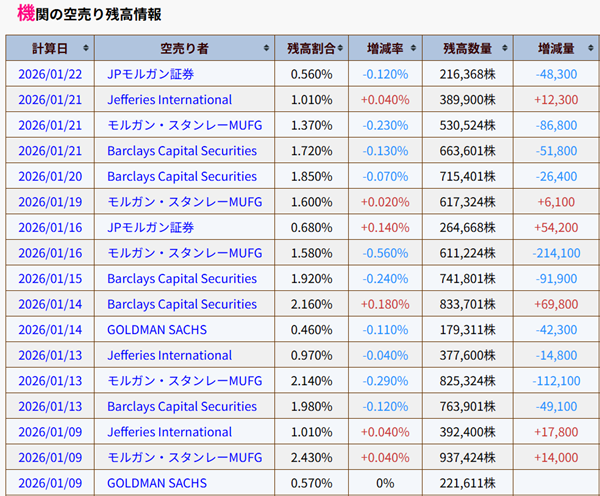 株価のピークは2026年1月16日だったが、そこまでに多くの空売りが積みあがっていたため、空売り機関は株価のピークで買戻しを迫られた。