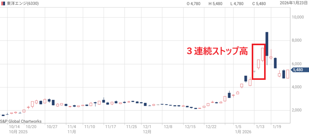 1月13日~15日に3連続ストップ高となり、勢いで1月16日もストップ高水準まで上昇後、一転して-19%安に急落した。