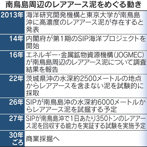 沖ノ鳥島のレアアース開発の経緯と見通し。商業採掘は2030年頃になるとされる。出典:日本経済新聞